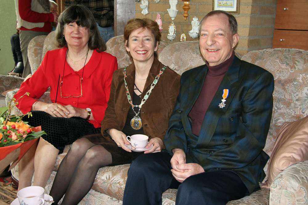 Omringd, door v.l.n.r. zijn broer, Hein, cursiste, Kees, echtgenote, Carolina, cursiste en aanvraagster van Waalbrugspeld EN Ridderorde, Paola, en dochter luistert Jan aandachtig, terwijl Burgemeester Guusje ter Horst haar prachtige speech voorleest....
